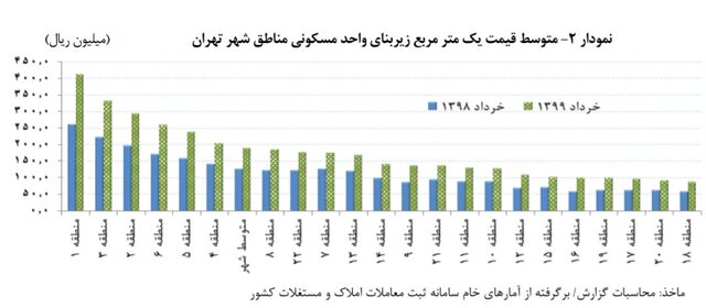 متوسط قیمت مسکن در پنج منطقه گرانقیمت شهر تهران طی خردادماه ۱۳۹۹ به ترتیب در منطقه یک ۴۱.۲ میلیون تومان، منطقه سه ۳۳ میلیون تومان، منطقه دو ۲۹.۳ میلیون تومان، منطقه شش ۲۵.۸ میلیون تومان و منطقه پنج ۲۳.۷ میلیون تومان در هر مترمربع بوده که رشد ماهیانه قیمت در این مناطق به ترتیب ۲۱.۸ درصد، ۷.۸ درصد، ۱۰.۹ درصد، ۵.۷ درصد و ۱۱.۲ درصد بوده است.